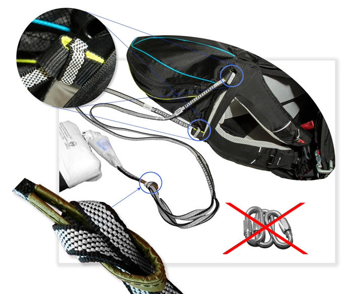 The smart design of the Universal Bridles allows for connecting the reserve parachute to the harness without any metal links, further reducing weight and improving safety and strength.